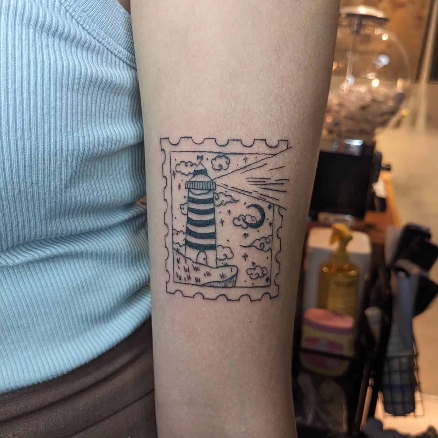 Another win for the stamp frame! This tattoo features a lighthouse surrounded by a detailed stamp-like border, showcasing a distinctive blend of maritime and postal themes.