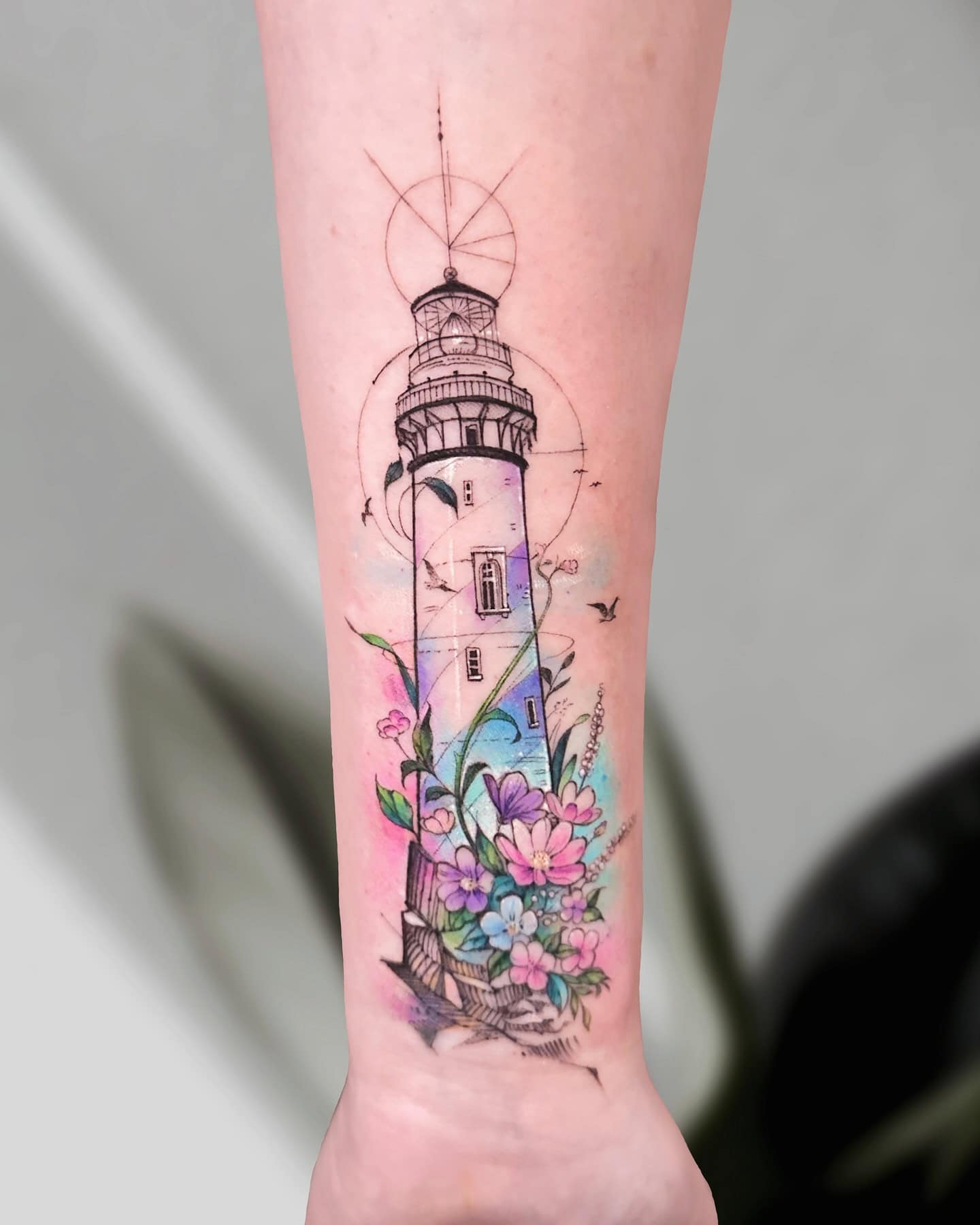 What a gorgeous tattoo! This one features a striking lighthouse surrounded by a vibrant array of flowers.