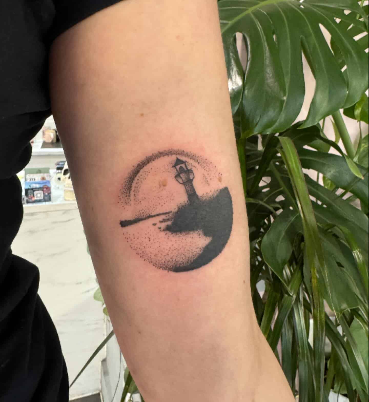 This is so dreamy and subtle. This tattoo features a minimalist lighthouse surrounded by a soft, dotted moon halo.