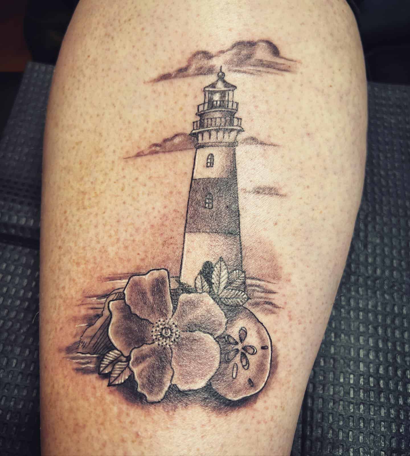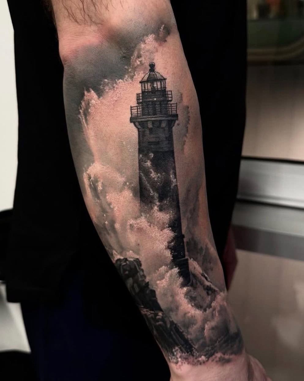 For a moodier vibe, this one is perfect. The tattoo has a detailed lighthouse rising prominently against a backdrop of swirling clouds.
