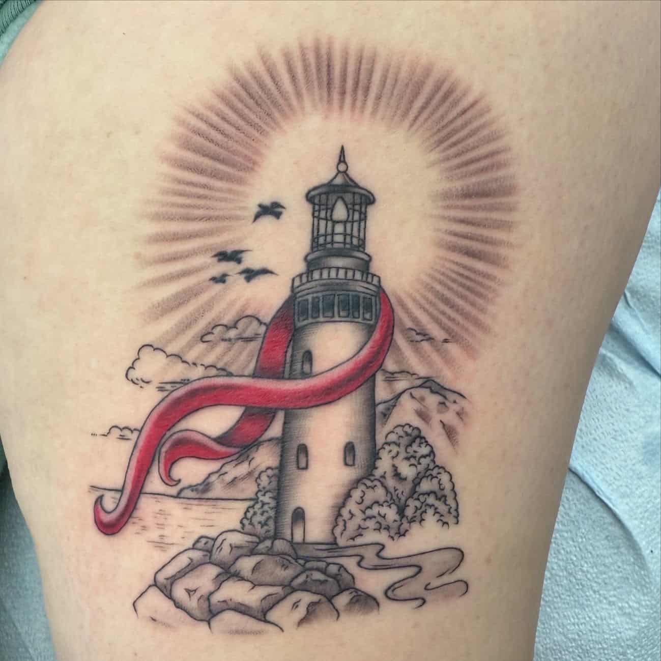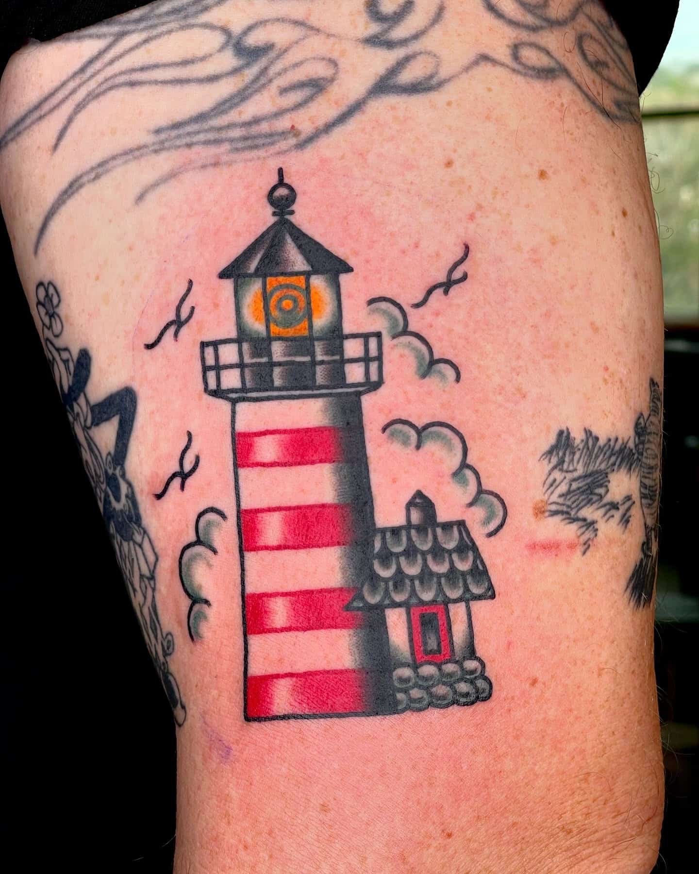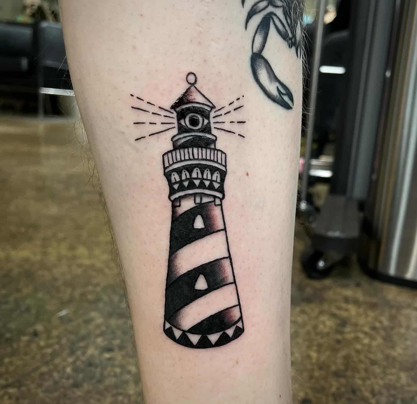 This tattoo is so prominent and eye-catching. It features a red and black striped lighthouse, topped with a glowing light that really draws your eye.