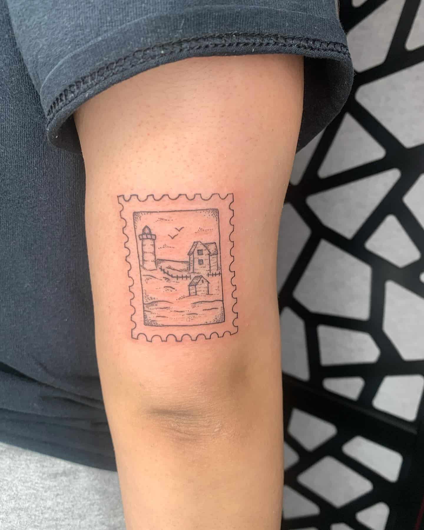 I’m so into these stamp designs! This tattoo has a lighthouse scene framed within a stamp-like border, showing off a serene coastal landscape.