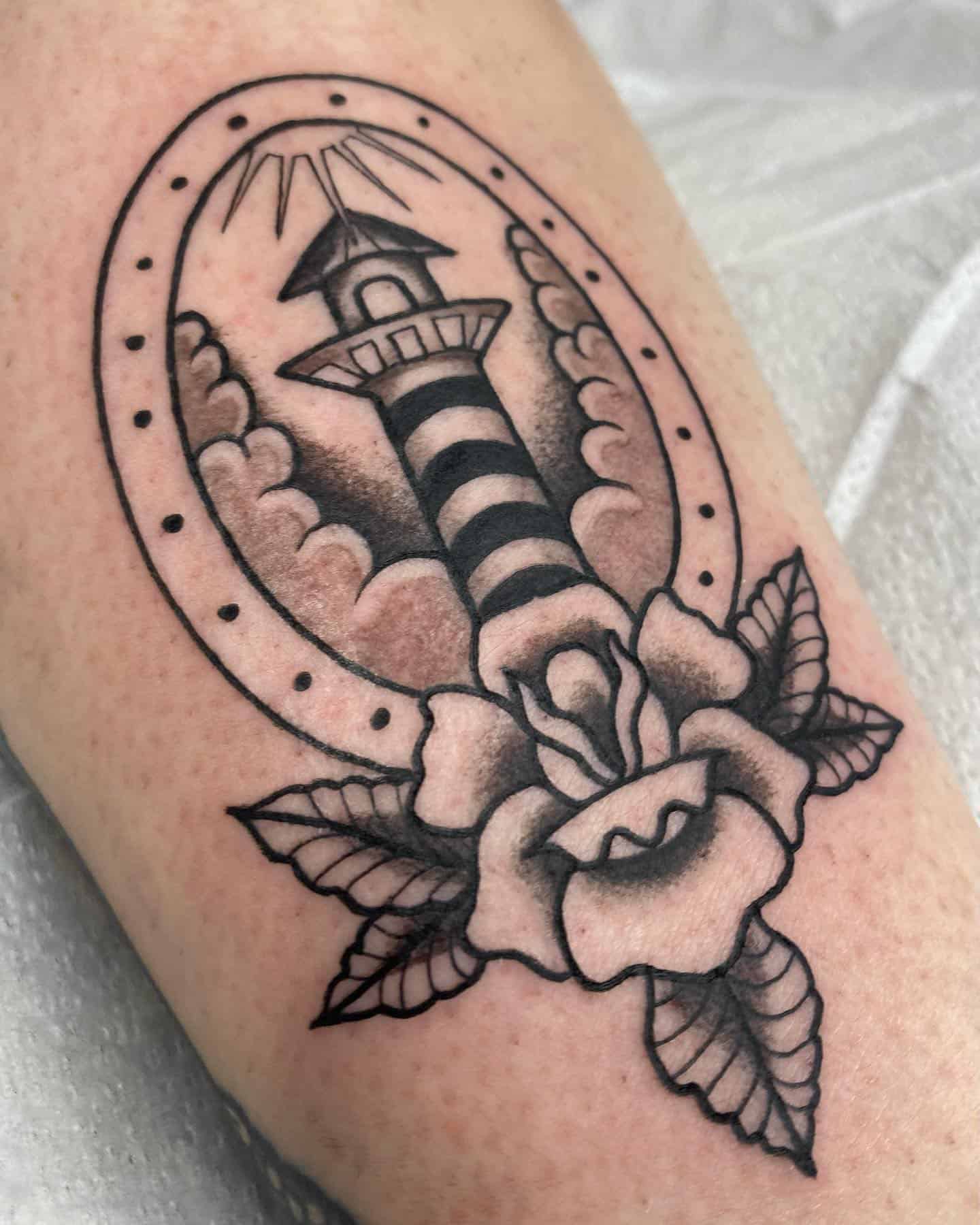 This tattoo is so pretty. It features a detailed lighthouse right at the center, encircled by elegant rose blossoms and leaves.