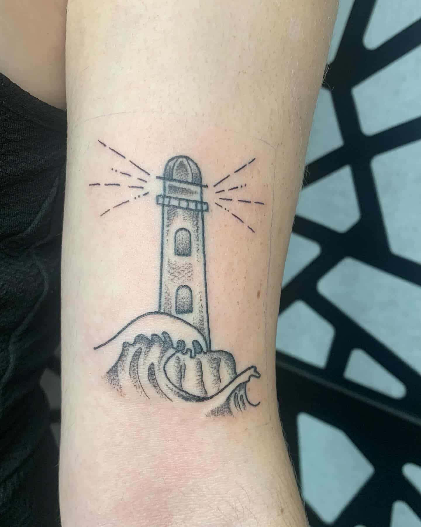 I love the bold, clean look of this one. The tattoo features a lighthouse standing tall with rays of light coming from its top, surrounded by these stylized waves.