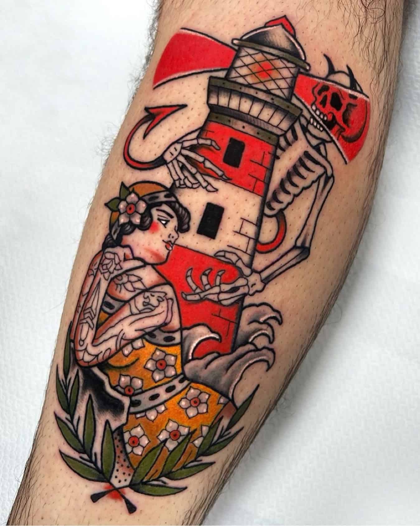 This tattoo is so cool and unique! It features a skeleton entwined with a lighthouse, which creates a really interesting blend of life and death.