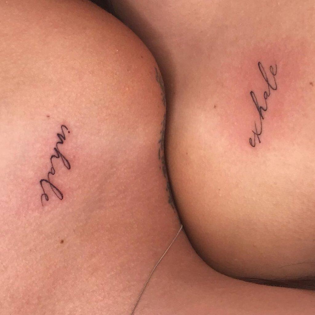 This is such a calming concept. One friend gets “inhale” inked on her shoulder, and the other gets “exhale,” both in a gentle, cursive font.