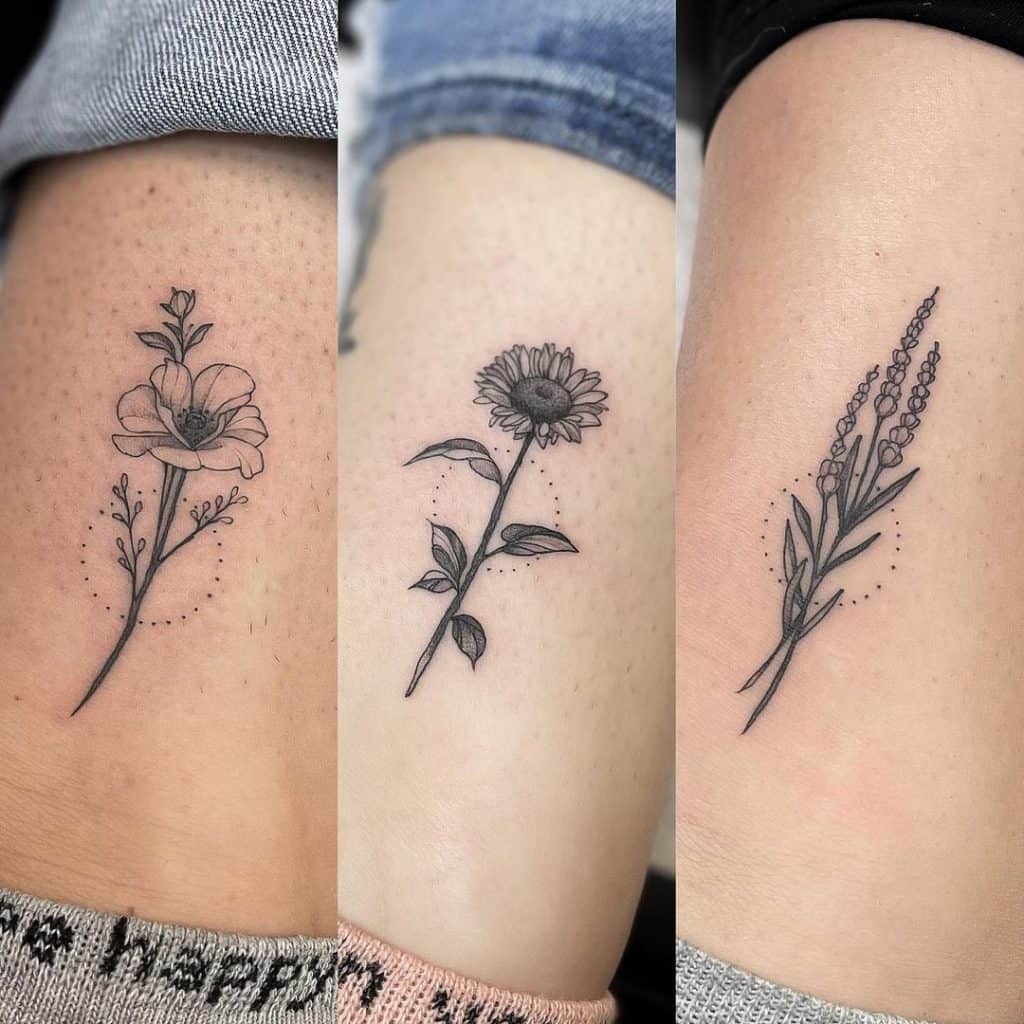These are beautifully detailed tattoos. The set shows three different flowers: a poppy, a sunflower, and lavender.