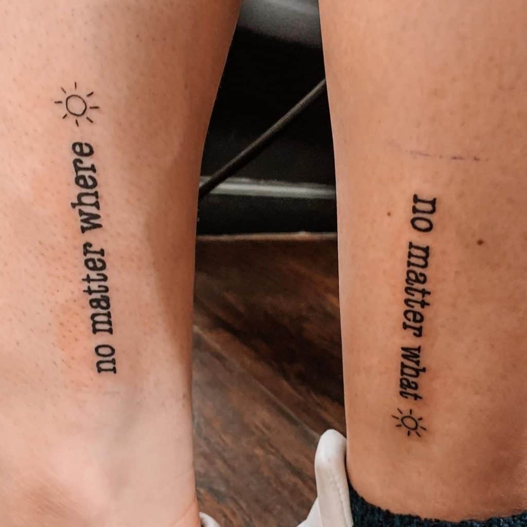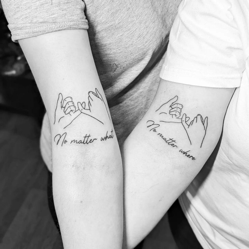 There’s something so classic about a pinky promise. These matching tattoos show the outline of two hands making that promise, with one design getting the phrase “No matter what” and the other “No matter where” written below.