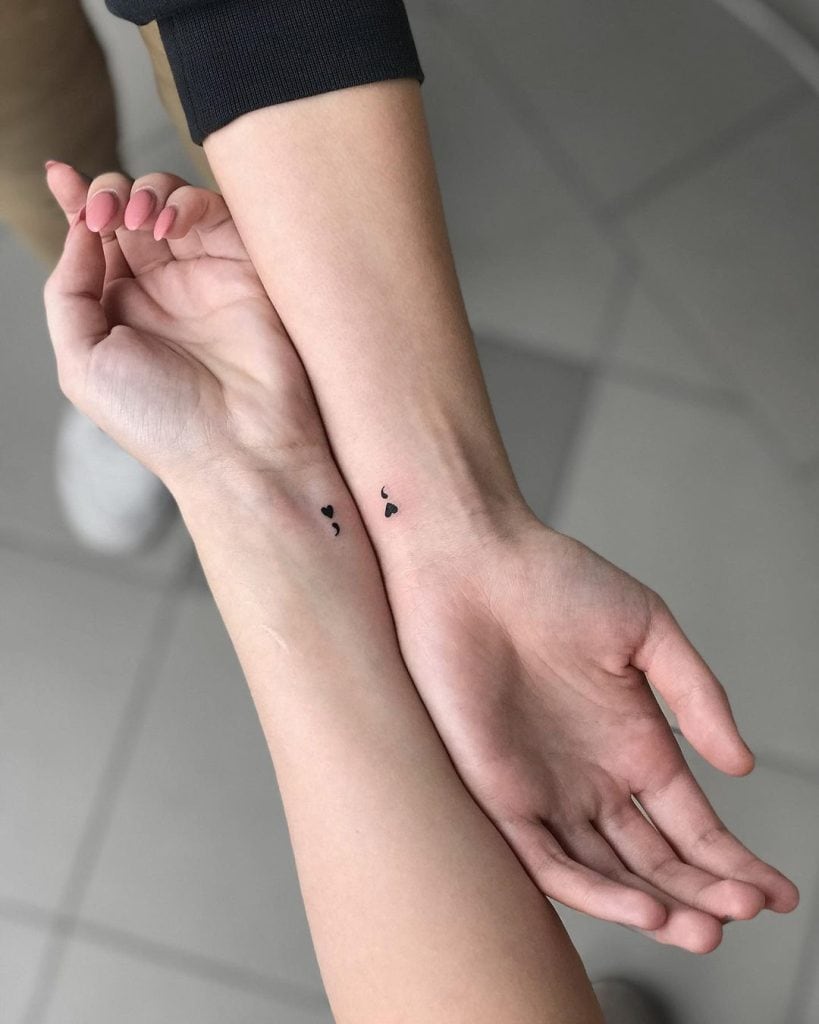 These minimalist tattoos are so meaningful. They feature tiny semicolons paired with hearts, symbolizing continuity and love.