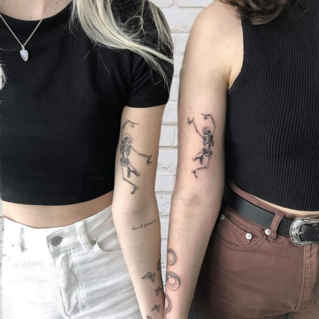 15. Dancing Skeleton Friendship Tattoos on Arms