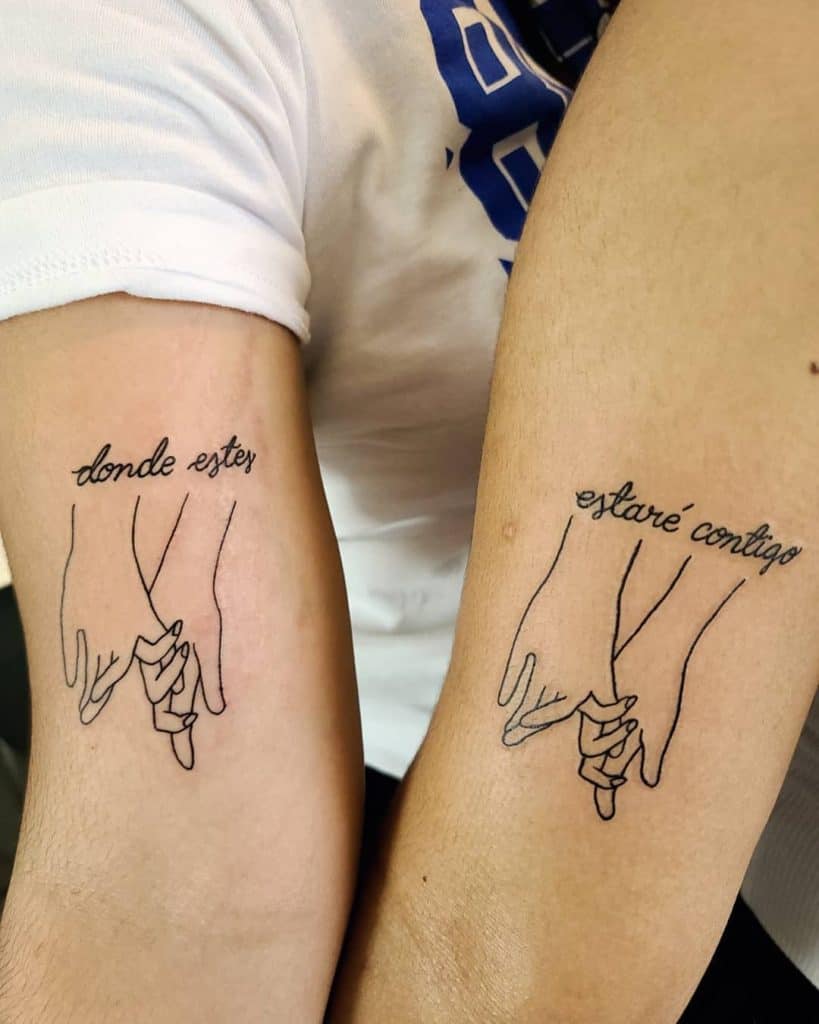 These are so beautiful. The tattoos show two hands linked in a pinky promise, with the Spanish phrases “donde estés” (wherever you are) and “estaré contigo” (I’ll be with you) written above in elegant script.