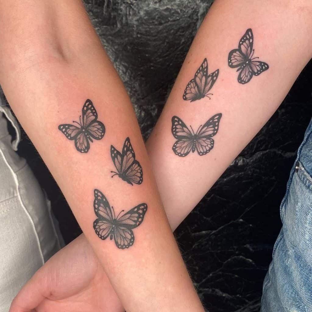 32. Matching Black Ink Butterfly Tattoos on Forearms