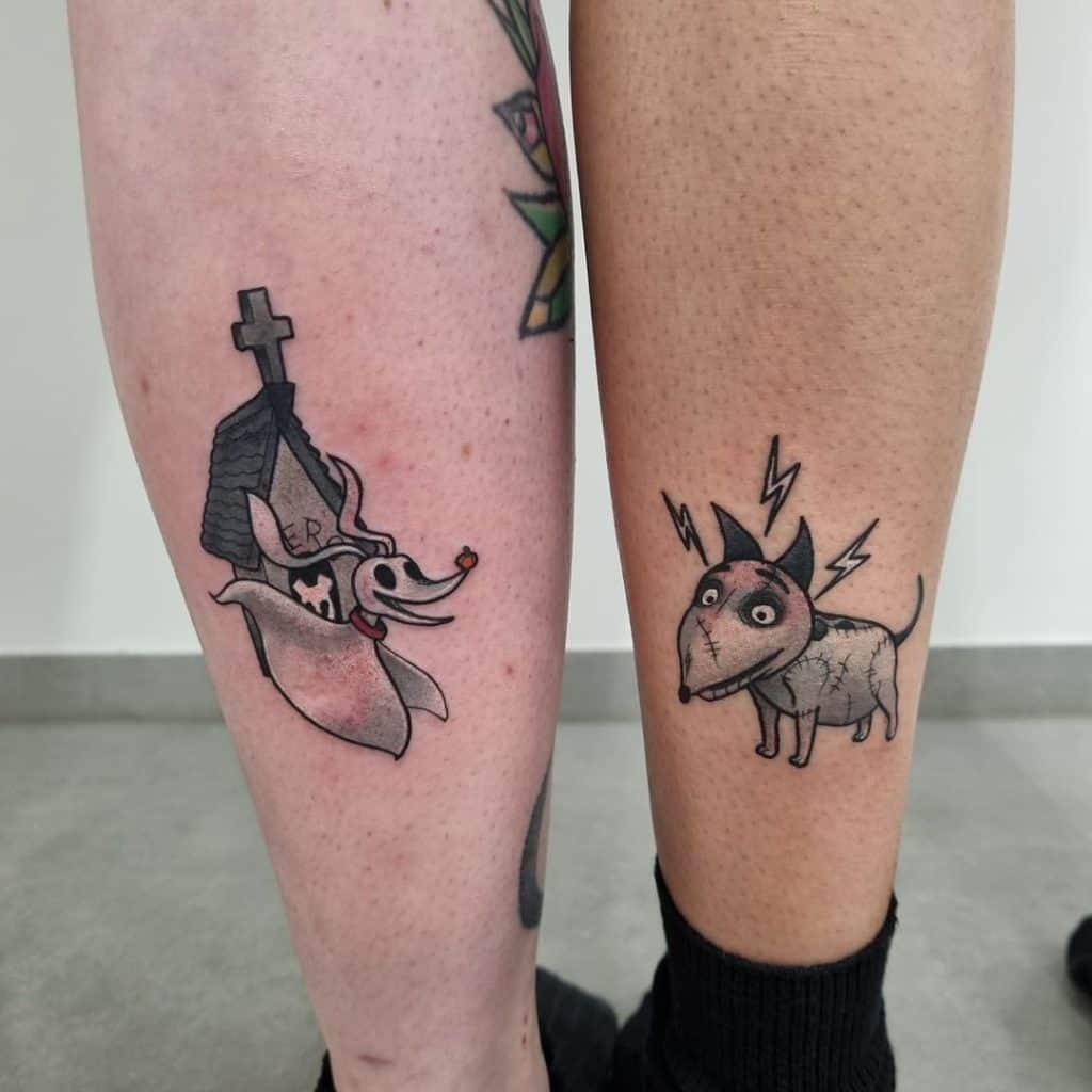 13. Matching Halloween-Inspired Ghost Dog Tattoos on Calves