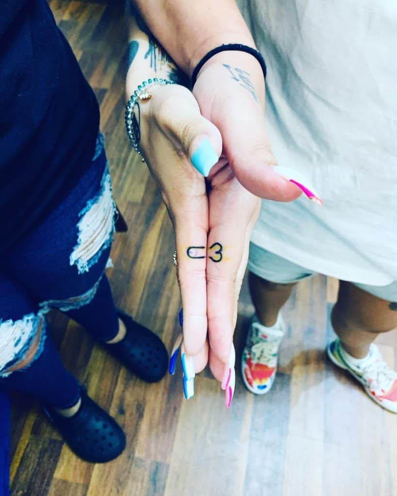 These small tattoos are all about humor. Each friend gets a minimal design on their finger that is only completed when they’re placed together.