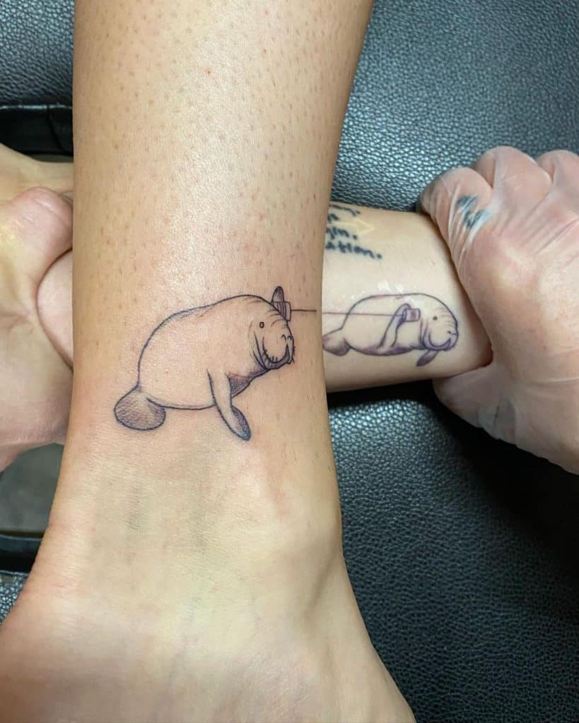 You just can’t beat this level of cute. These tattoos feature adorable, smiling manatees on each friend’s ankle, giving off a totally lovable and laid-back vibe.