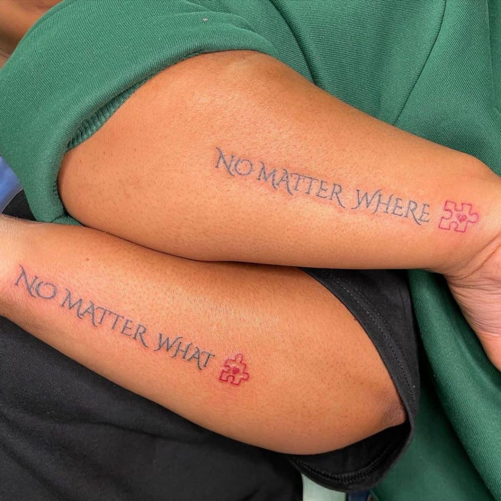Each arm tattoo has the phrase “No Matter Where” or “No Matter What” in a classic font, and they’re paired with a small red puzzle piece.
