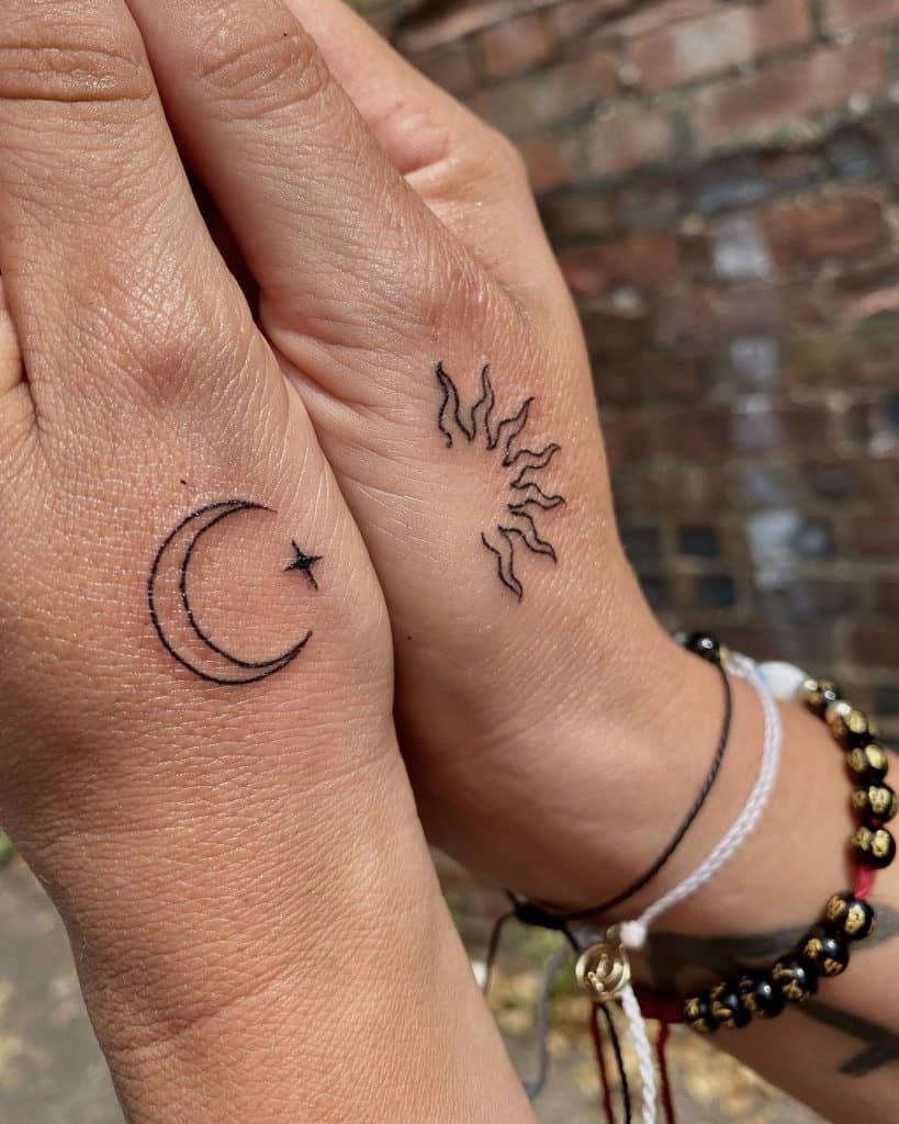 30. Minimalist Sun and Moon Friendship Tattoos on Hands