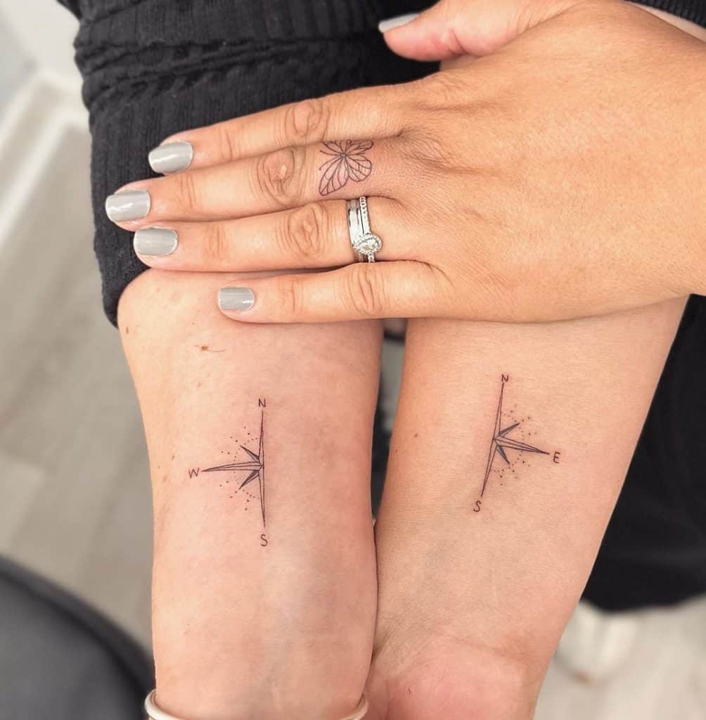 I find these minimalist compass tattoos, inked on the wrist, so chic. Each one has fine lines and tiny dots coming from the center, with letters for each direction.