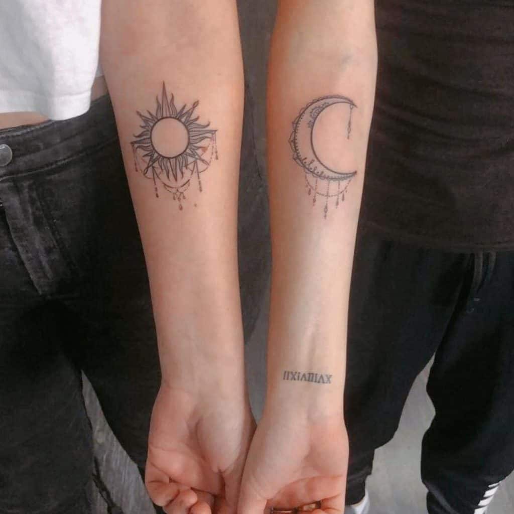 You really can’t go wrong with a classic sun and moon design. I love that one forearm has an intricate sun with rays and dangling details, while the other features a crescent moon with similar delicate accents.
