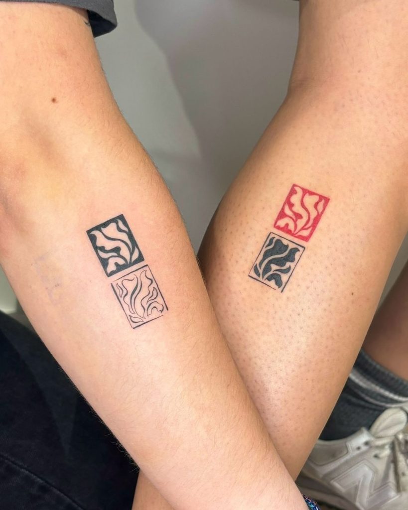 One square is in black ink and the other is in red. These unique patterns are a cool way to symbolize your individuality within a shared connection.