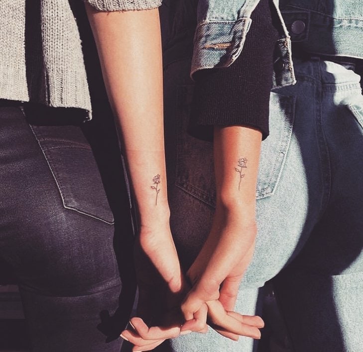 These tiny rose tattoos are beautifully inked on each friend’s inner wrist. I love the simple line style that really captures the elegance of a single flower.