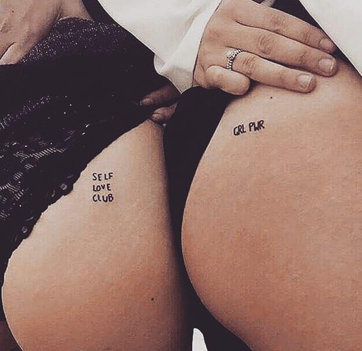 These tattoos are bold, meaningful, and just so cool. Placed on the hip, they read “SELF LOVE CLUB” and “GRL PWR.”