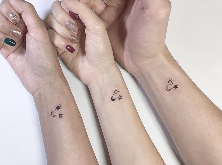 Each wrist in this trio has a small sun, a crescent moon, and a star inked in a delicate, minimalist style.
