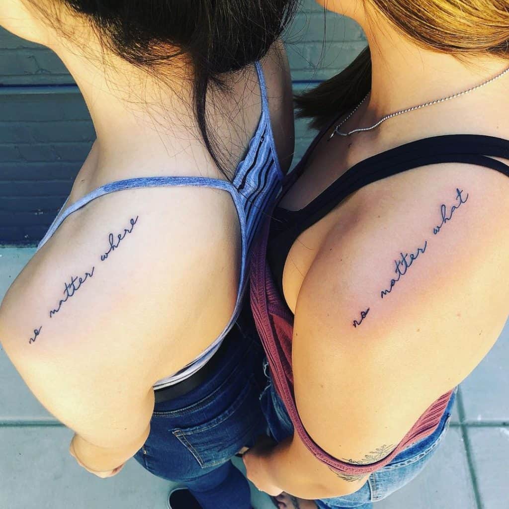 One friend has the words “no matter where” tattooed on her shoulder, while the other has “no matter what.” Both are done in a delicate, cursive script.