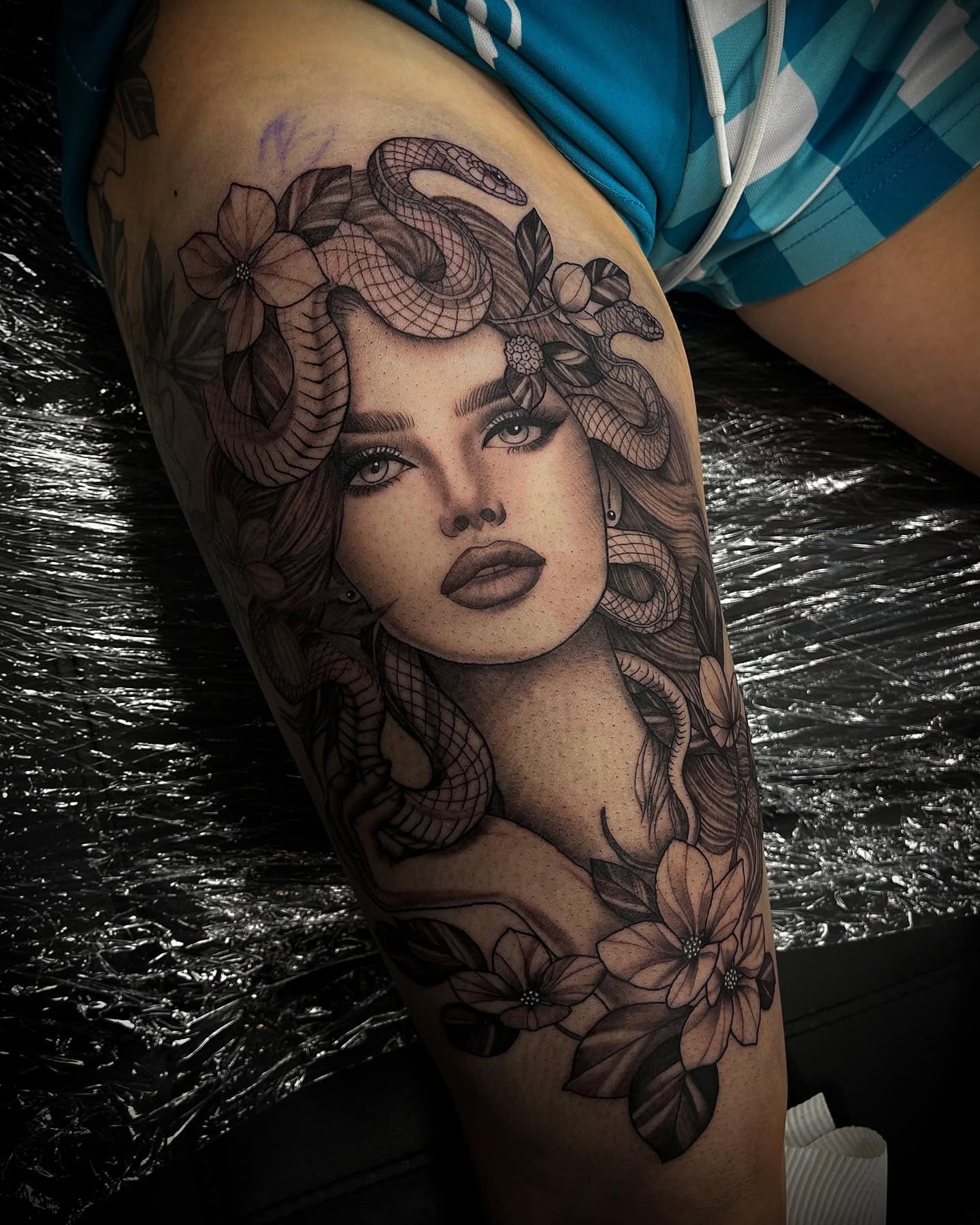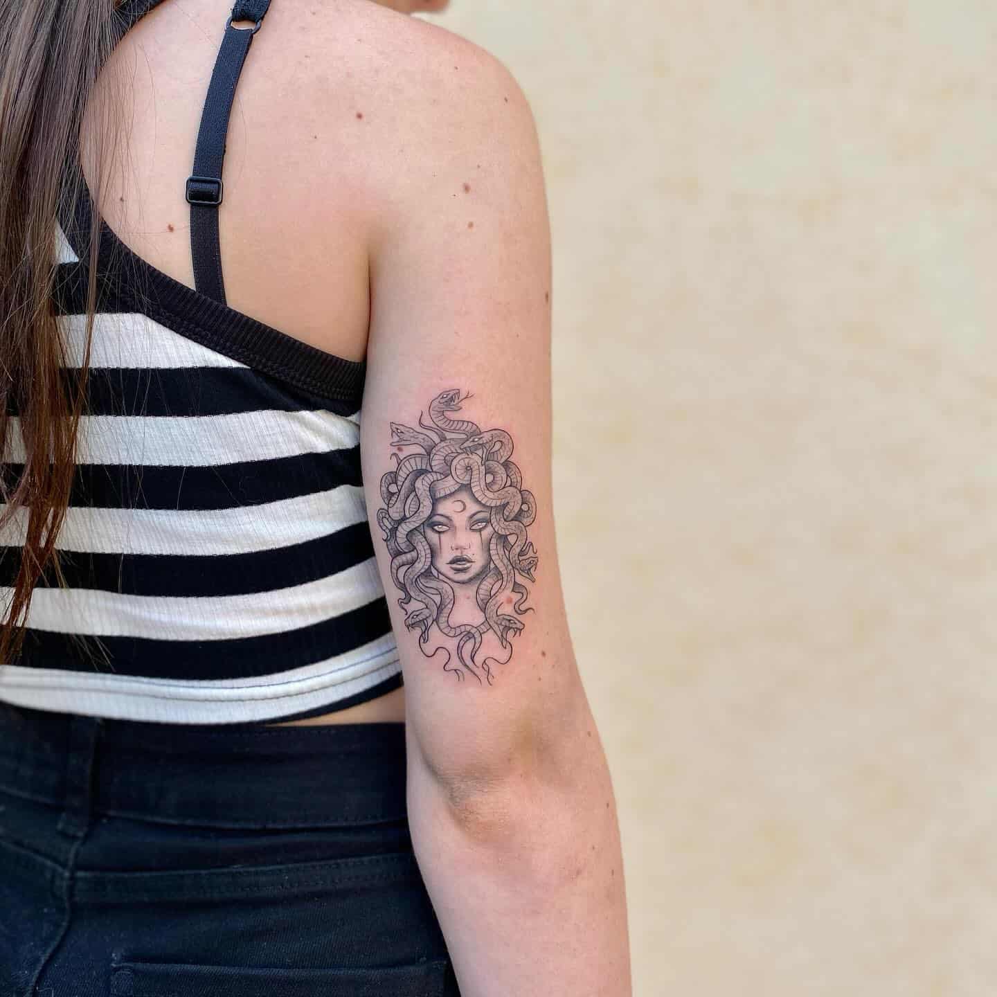 This look is a great option for those who want a classic with a twist. The tattoo features a detailed portrayal of Medusa, highlighted by her flowing hair made of intertwined snakes. I love how the artist uses fine lines and shading to create depth.