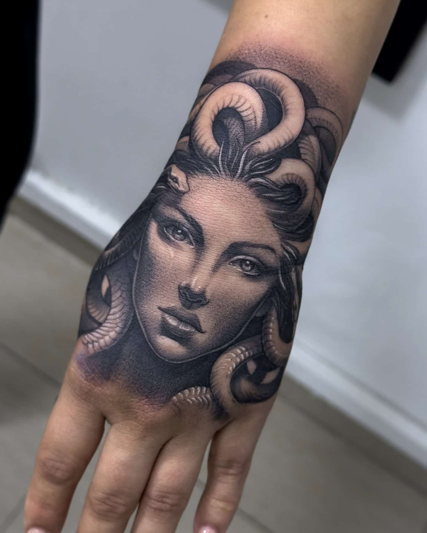 It highlights her facial features while the snakes add a dynamic element to the design. This is ideal for someone looking to express strength and individuality and make a bold statement on their hand.