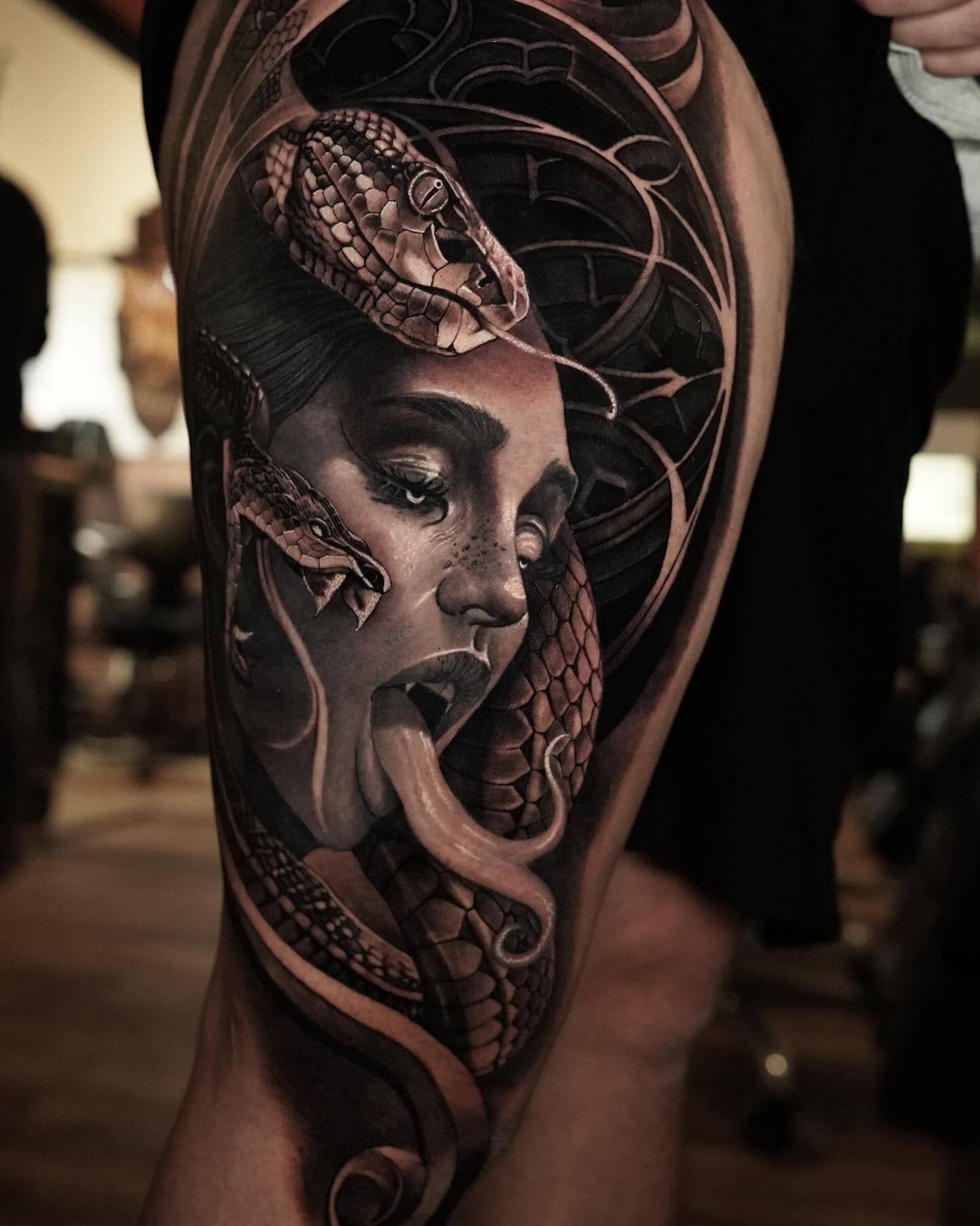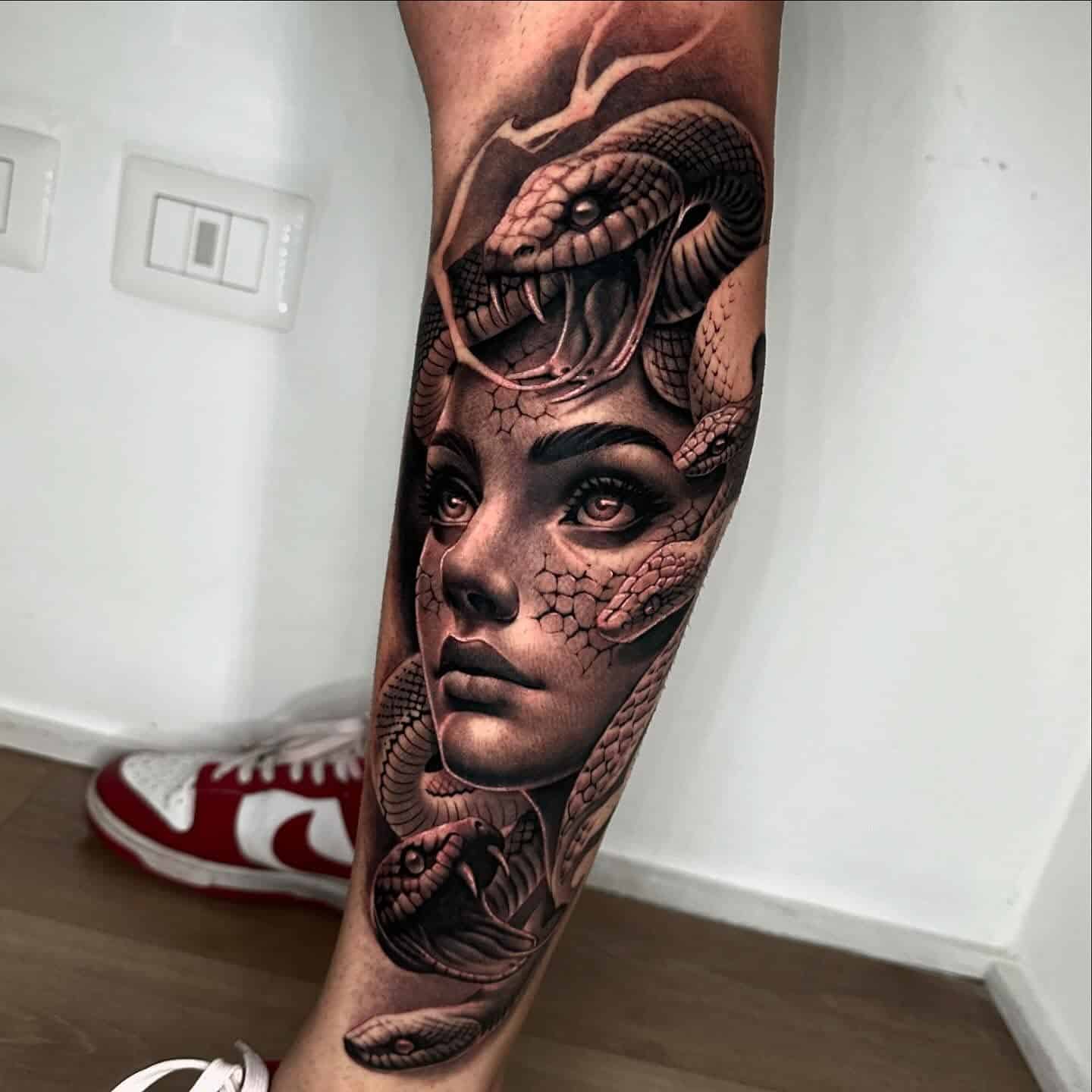 I’m a big fan of this next piece, and I think you will be too. The tattoo showcases Medusa with a detailed arrangement of snakes forming her hair. Each one is meticulously shaded to give a lifelike appearance.