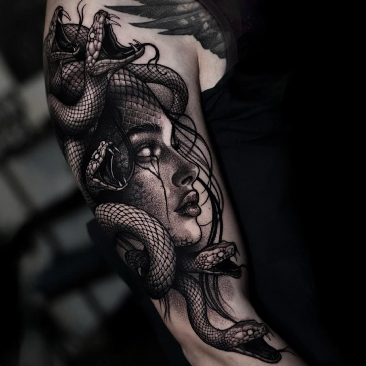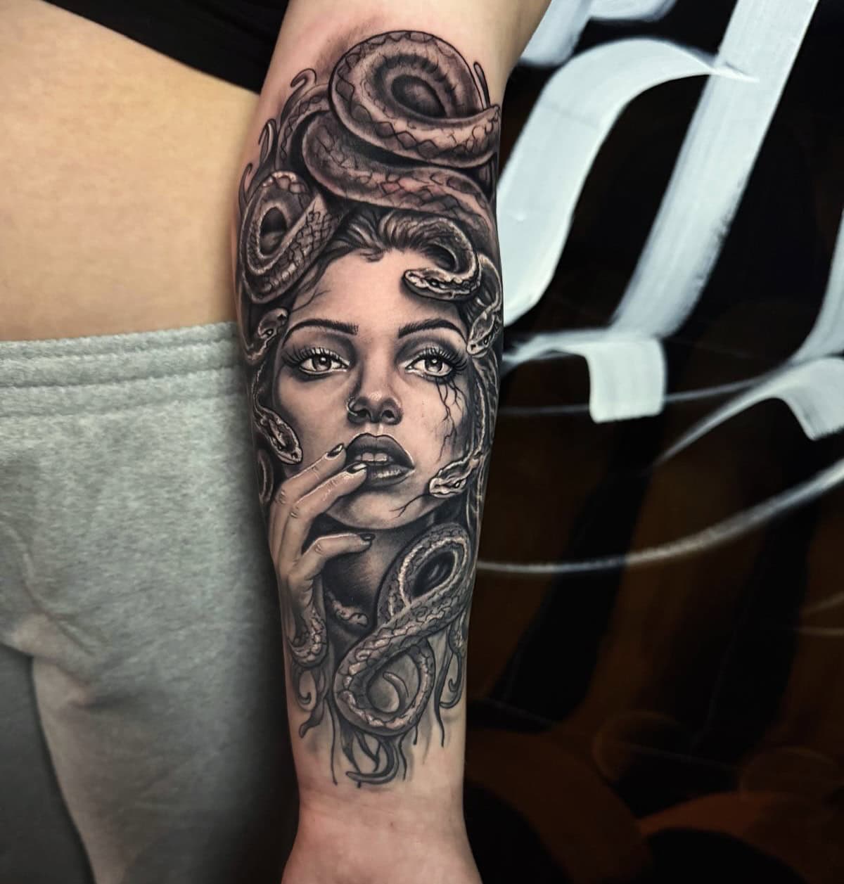 I’m a big fan of this next piece because of how expressive it is. The tattoo showcases Medusa with intricately detailed serpents woven into her flowing hair.