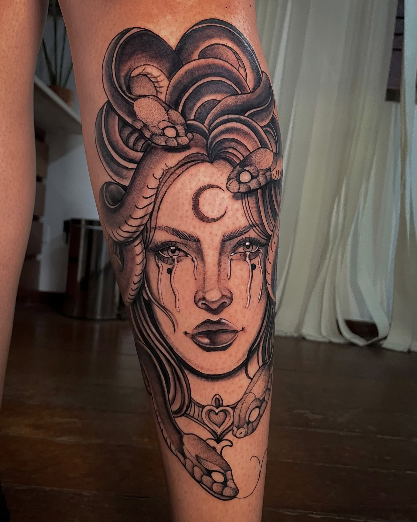 This tattoo is another one of my faves. It features a striking depiction of Medusa, characterized by her flowing hair entwined with serpents.
