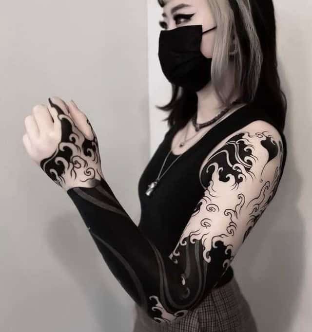 I love this striking tattoo design. It features intricate wave patterns that flow seamlessly across the arms, giving it a sense of movement and energy. The bold black ink contrasts beautifully with the skin, which makes the artwork stand out even more.