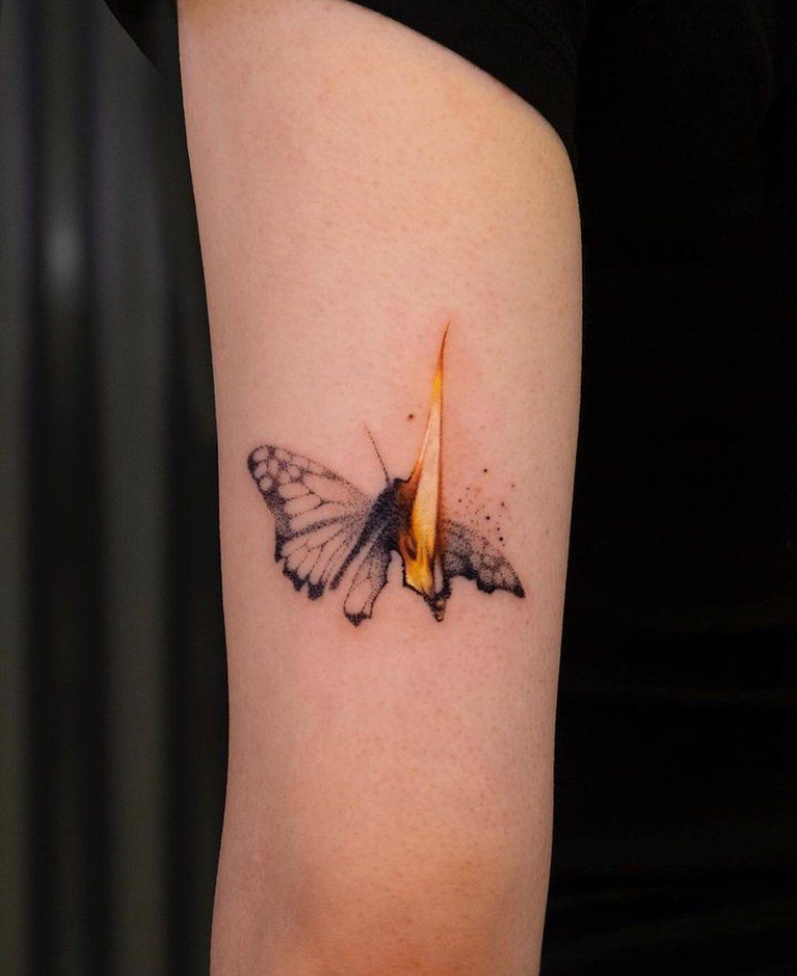 This tattoo beautifully combines the delicate image of a butterfly with a striking flame, which creates a stunning visual effect. I just love the contrast between the soft wings and the fiery detail; it tells a unique story of transformation and passion.