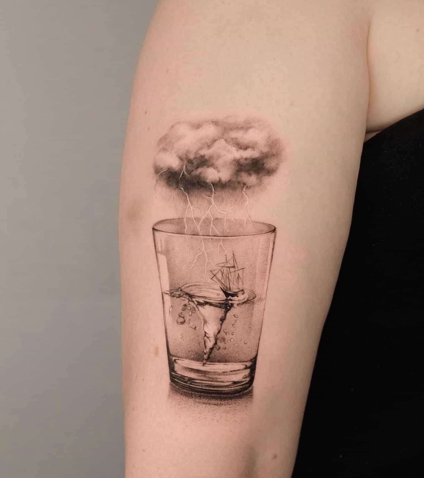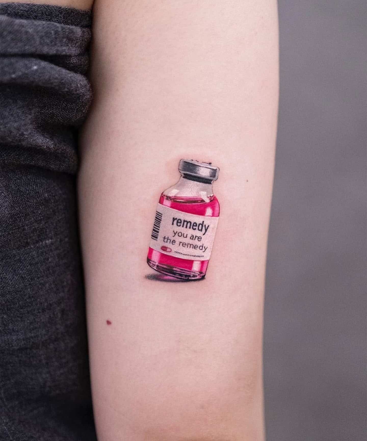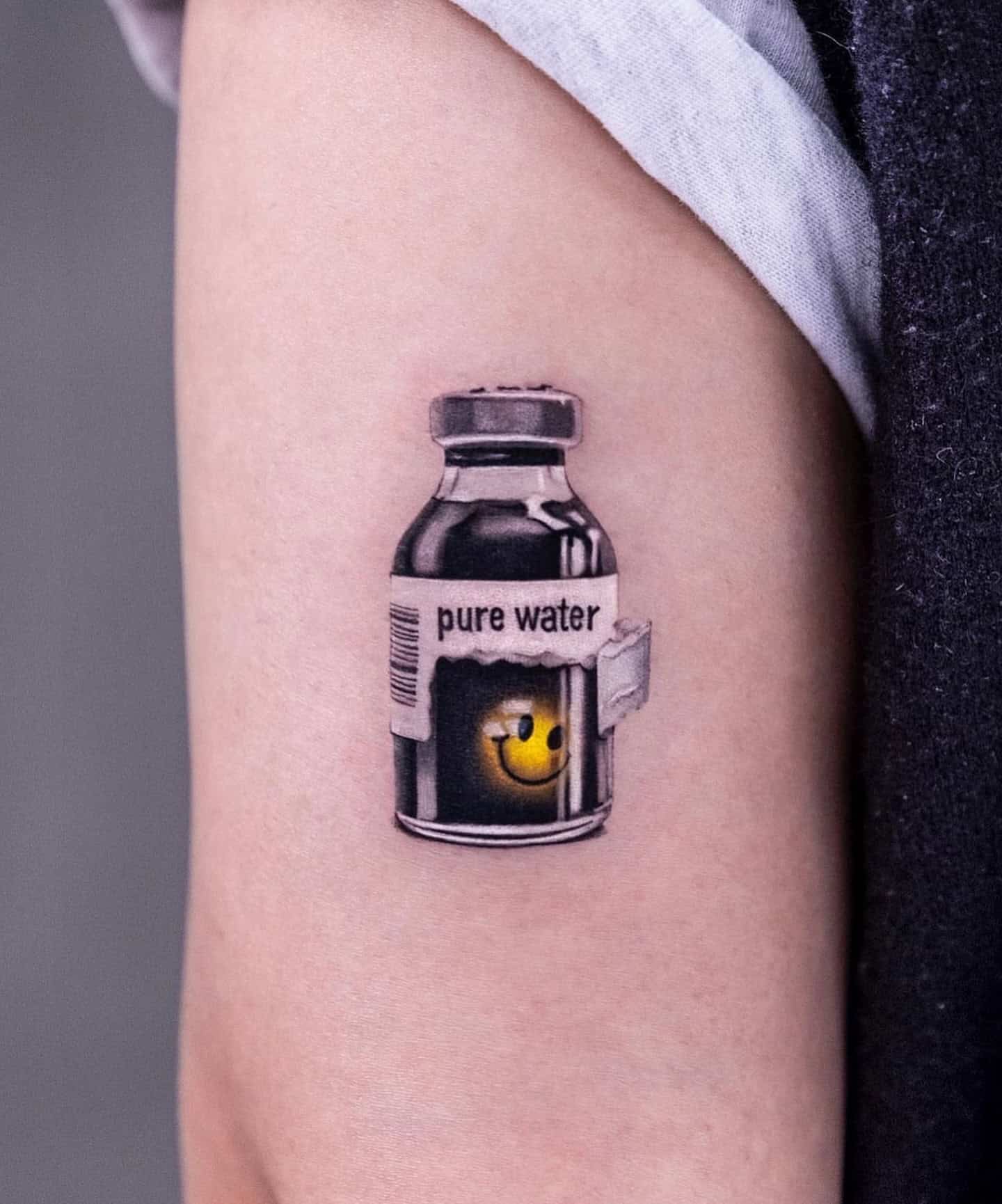 This tattoo totally stands out with its clever design of a bottle labeled “pure water” hiding a cheerful smiley face inside. I love that the playful concept adds a touch of whimsy, reminding everyone that joy can be found in the simplest things.