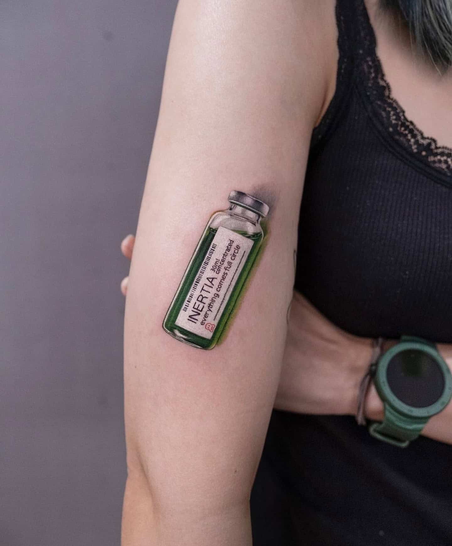 How cool is this one? It features an impressively realistic bottle, making it a total standout piece on the wearer’s arm. The intricate details and lifelike colors create a sense of depth that really draws your eye.
