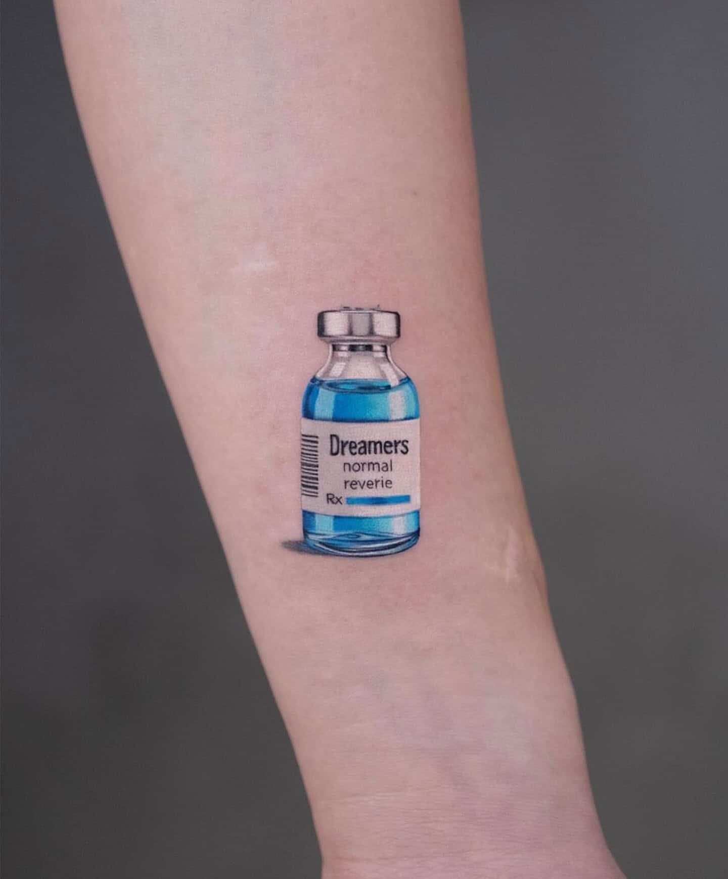 This tattoo has such a stunning depiction of a potion bottle labeled “Dreamers” in vibrant blue. It really captures the imagination, evoking thoughts of creativity and inspiration.
