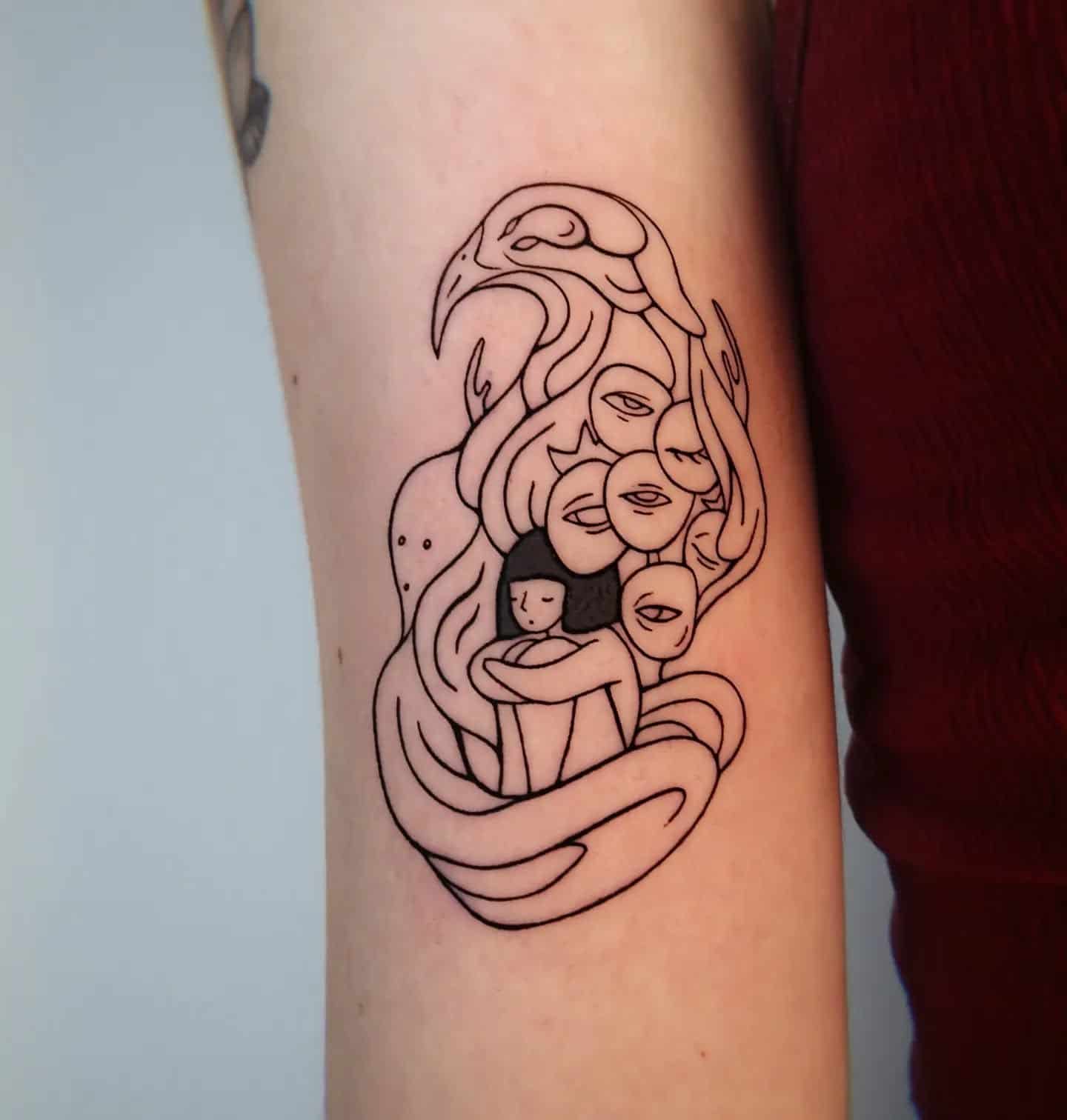 This tattoo is so beautiful and intricate, blending elements of nature and human emotion to create a story on the skin. The swirling shapes and faces evoke a sense of mystery and introspection, making it a stunning choice for anyone wanting to express their inner thoughts.