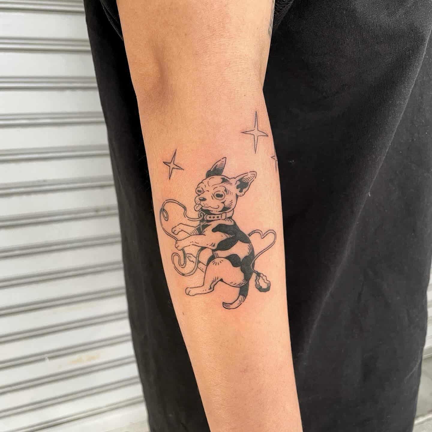 How fun is this tattoo? It features an absolutely adorable dog leaping joyfully, perfectly capturing the playful spirit of our pets. The intricate details and the whimsical stars around the pup add such a charming touch, making it a delightful piece of art.