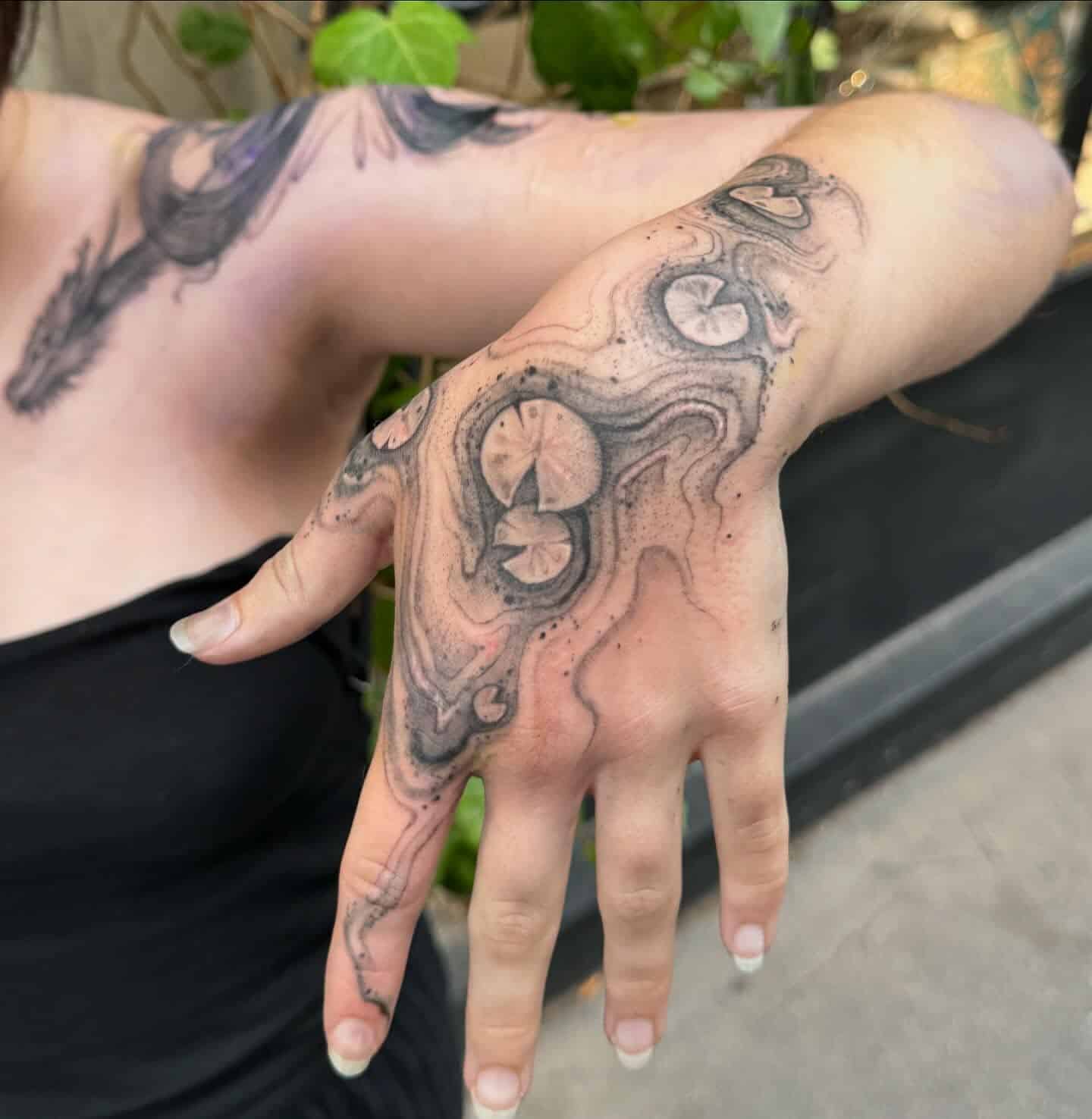 I love how this tattoo design stands out with its swirling patterns and delicate lily pads, creating a seriously stunning visual. The blend of shapes and shades gives it an artistic vibe, almost like a little painting right on the skin.