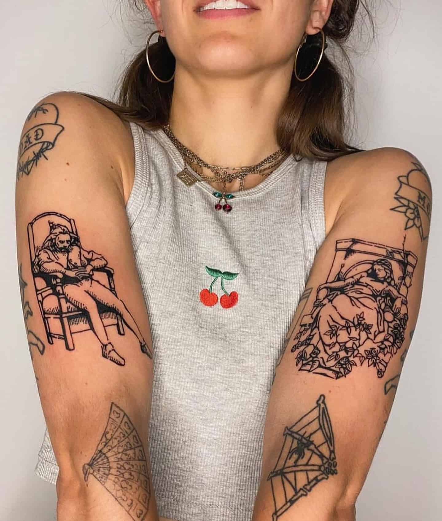 These charming tattoos tell a story through their unique designs, featuring scenes that pull you right in. I mean, one arm has a relaxed figure in a chair and the other shows a serene character in bed, creating this delightful contrast.