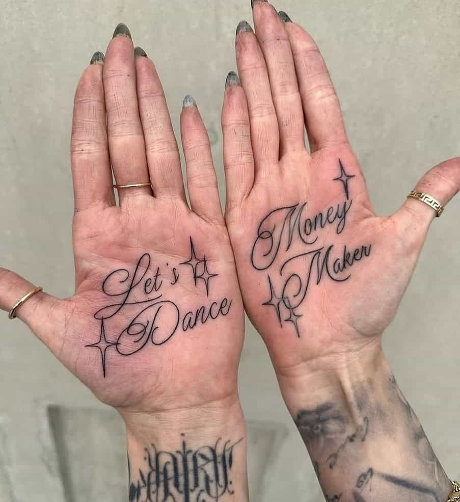 I love this creative choice. These tattoos feature playful phrases, “Let’s Dance” and “Money Maker,” elegantly inked on each palm. It not only showcases personal beliefs but also adds a fun twist to everyday life.