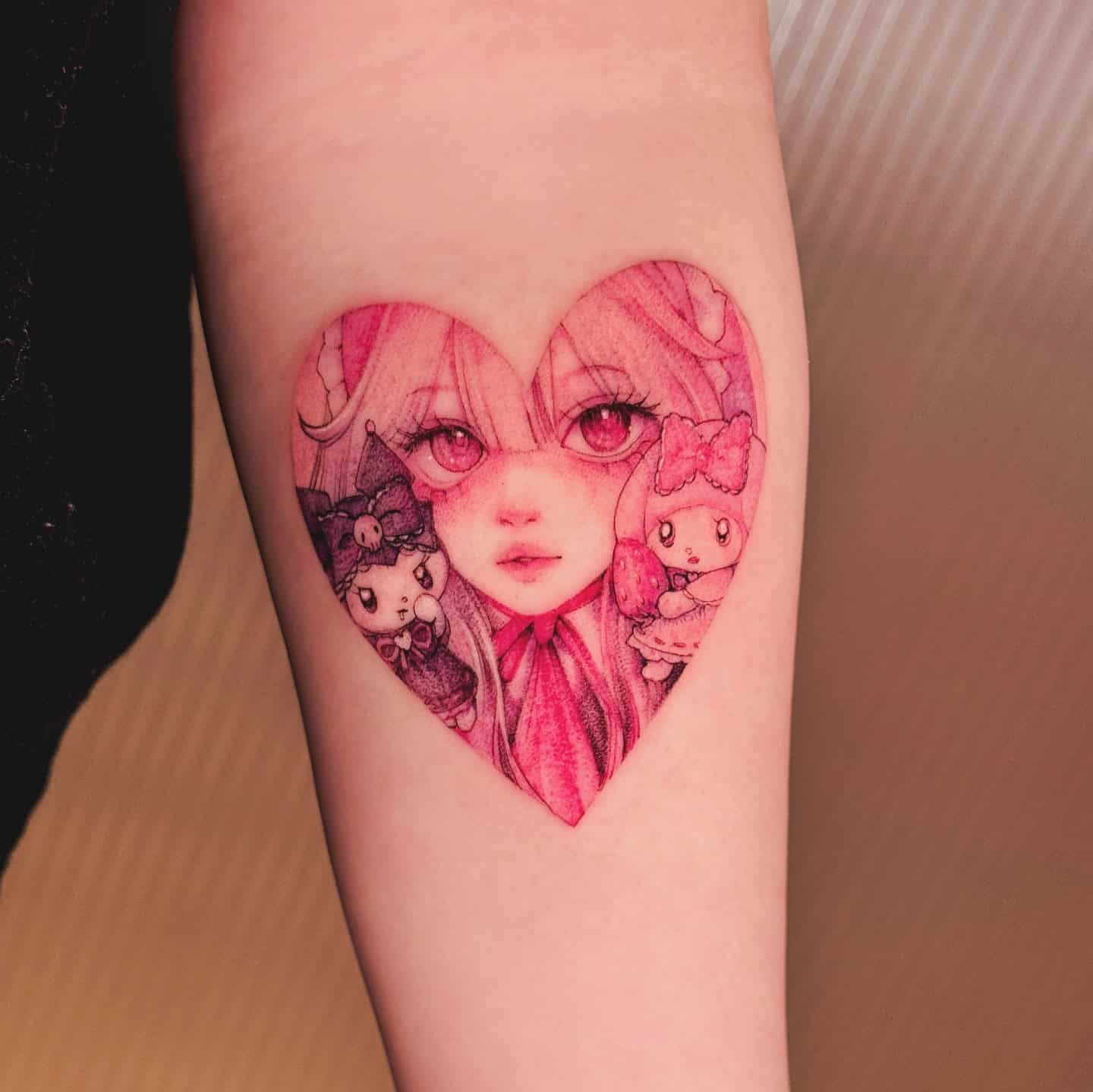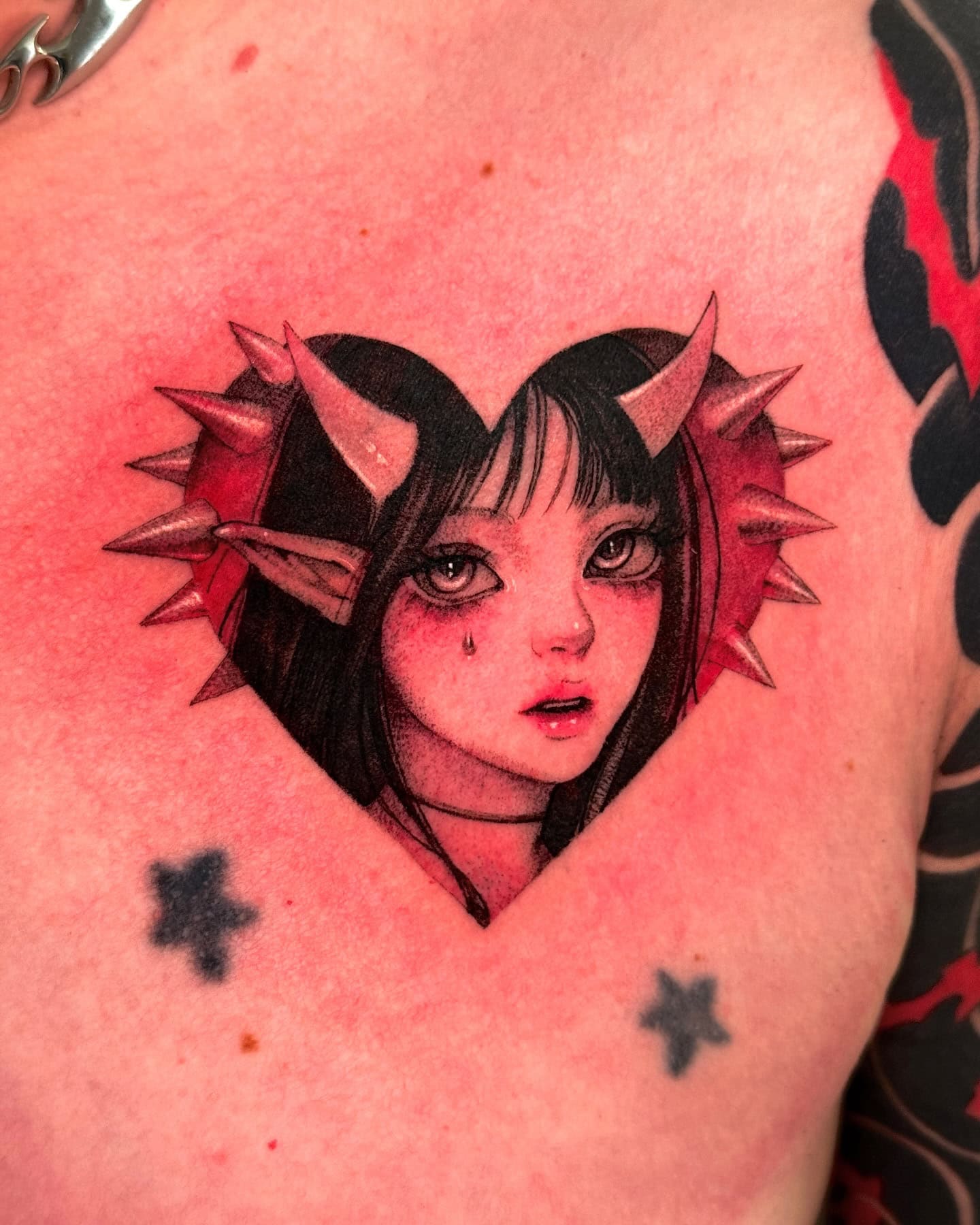 This tattoo is so striking. It features a design of a girl’s face framed by a heart, complete with sharp horns and a touch of red that adds a dramatic flair. The combination of beauty and edge makes this piece a total standout, telling a story of both vulnerability and strength.