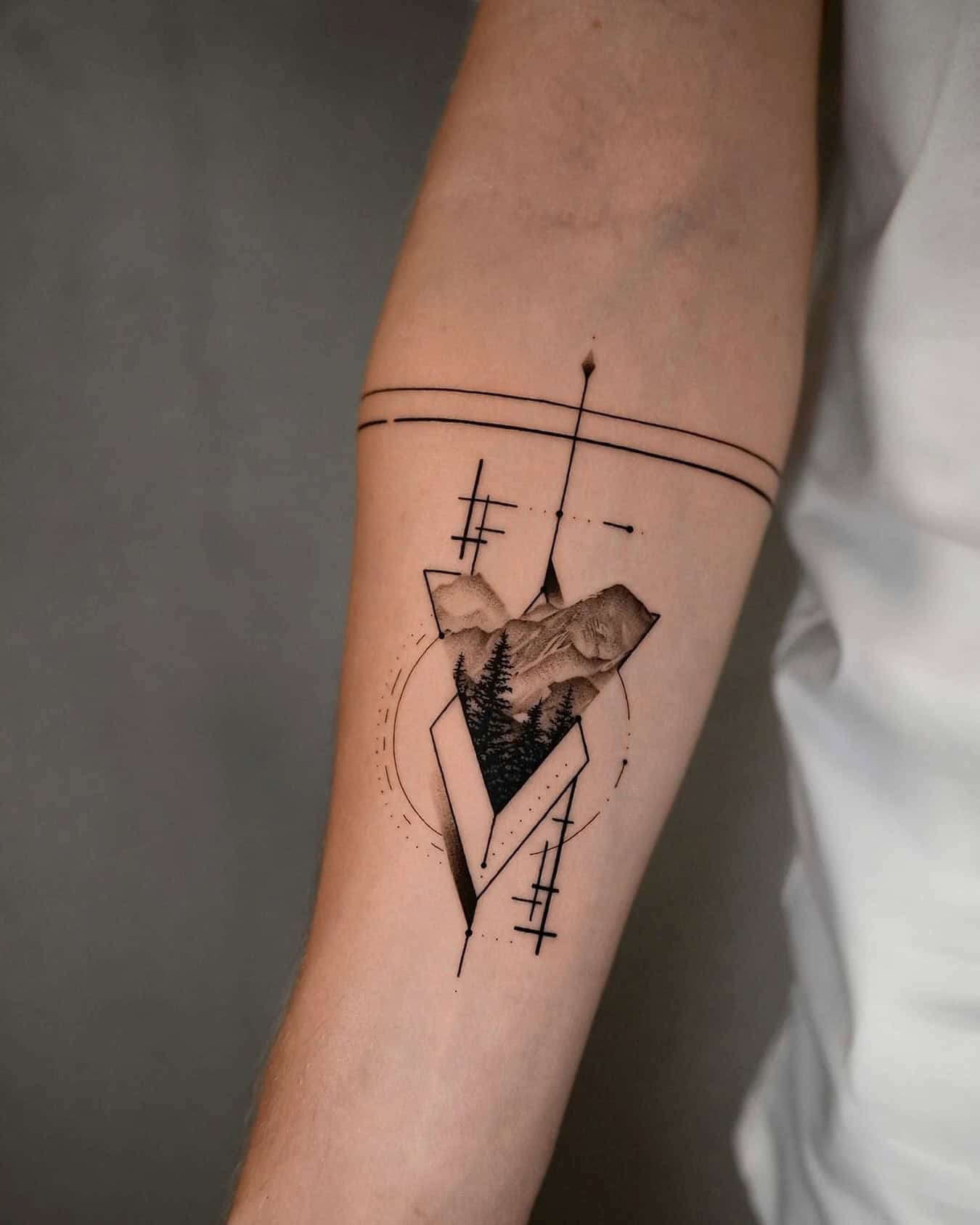 This one really stands out with its blend of sharp geometric shapes and a totally stunning nature scene inside. It’s got mountains and trees, capturing all the beauty of the outdoors while keeping a modern edge.