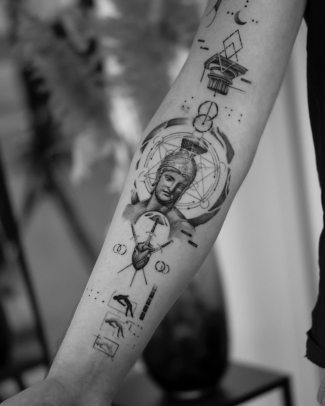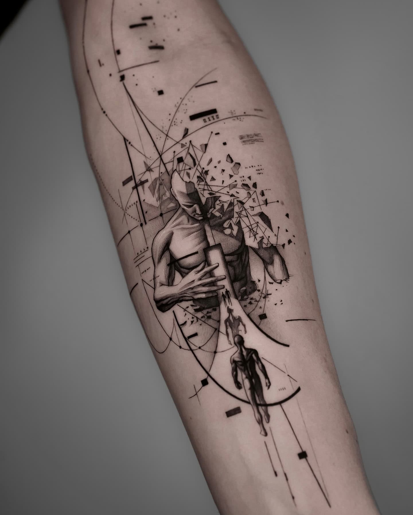 This tattoo really stands out with its striking depiction of a figure in motion, surrounded by geometric shapes and lines. I think the design creatively illustrates the journey of human evolution, blending art and meaning in a way that sparks curiosity.