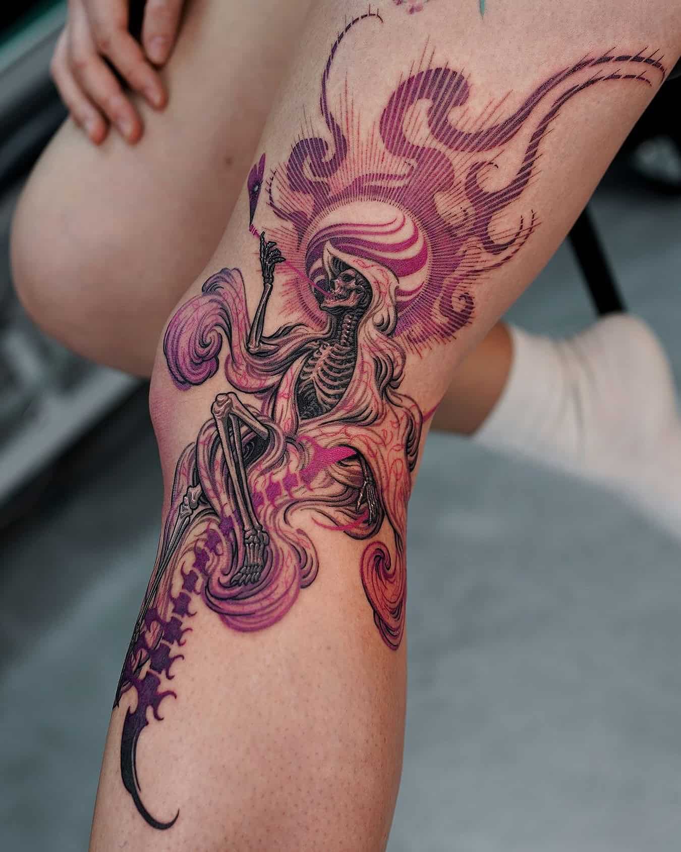 I mean, how unique is this? The tattoo features a blend of a skeleton and a jellyfish, creating a mesmerizing visual story on the thigh. The intricate details and vibrant colors make it not just a piece of art but also a total conversation starter.