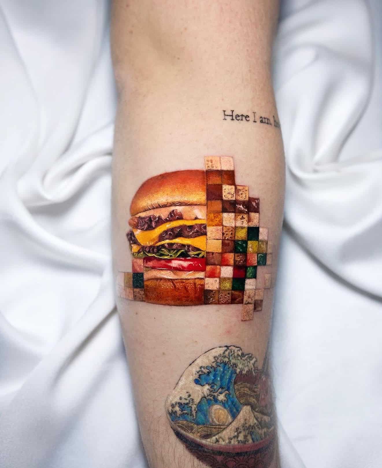 I am obsessed with this playful vibe! This tattoo showcases a vibrant burger design that seems to pop right off the skin. The colorful details and unique three dimensional look make it a total conversation starter.