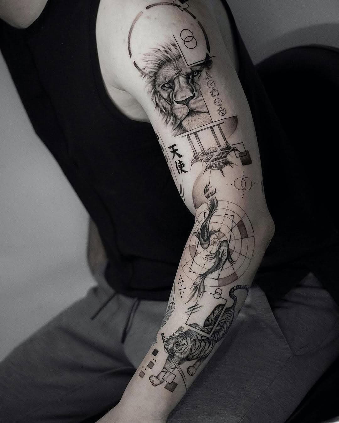 I think the combo of powerful animals, along with abstract shapes and symbols, tells a story of strength and bravery. For anyone looking for a one-of-a-kind idea, blending different elements like this is a perfect way to create a personal masterpiece.