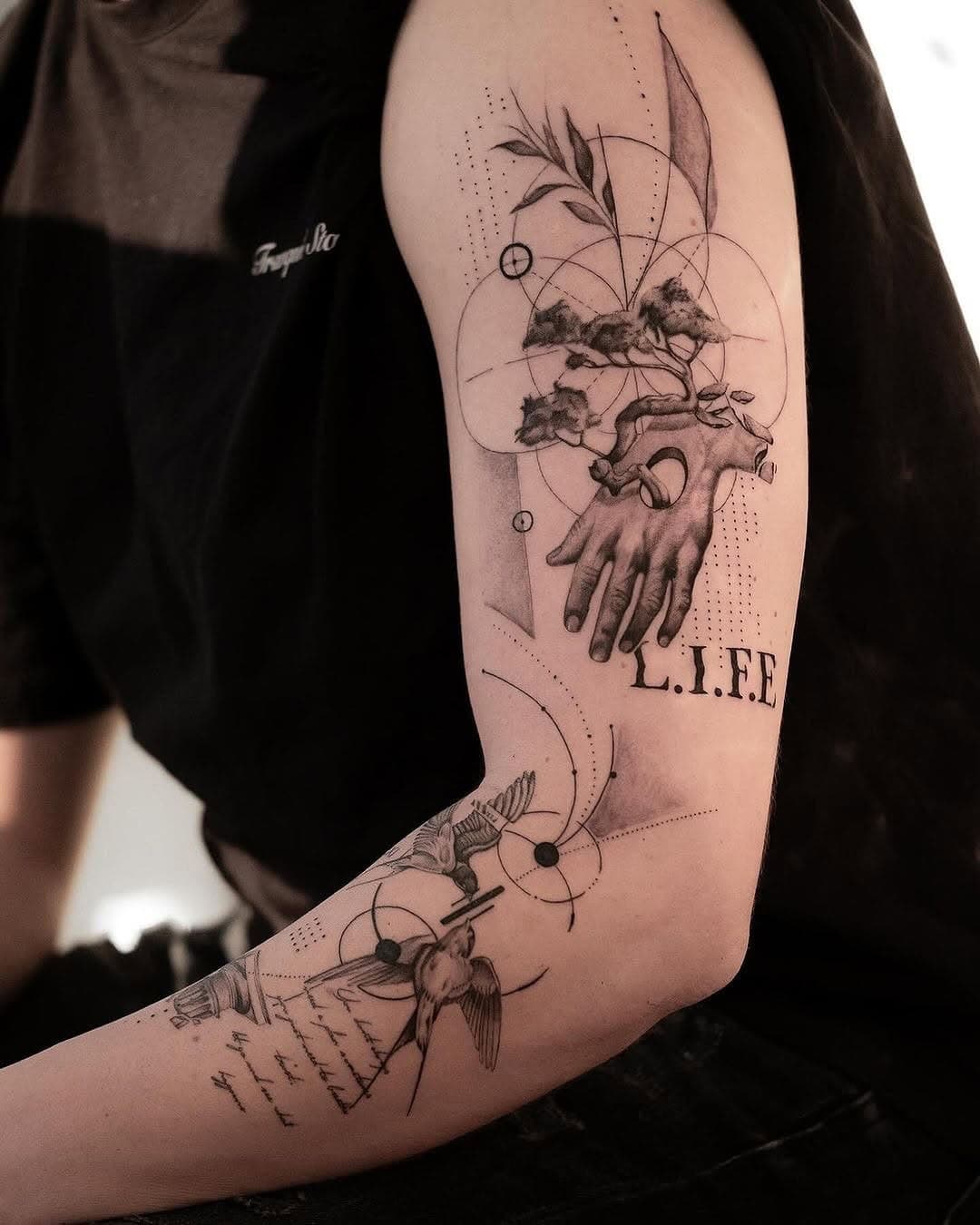 I think this tattoo is just stunning. It combines elements of nature and humanity in such a beautiful way, featuring a hand intertwined with trees and delicate birds.